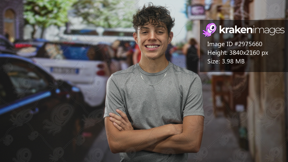 Teenage man standing with arms crossed and smiling on a busy street wearing gray tshirt and silver necklace, cars and storefronts visible; youth confidence energy. - Kraken Images
