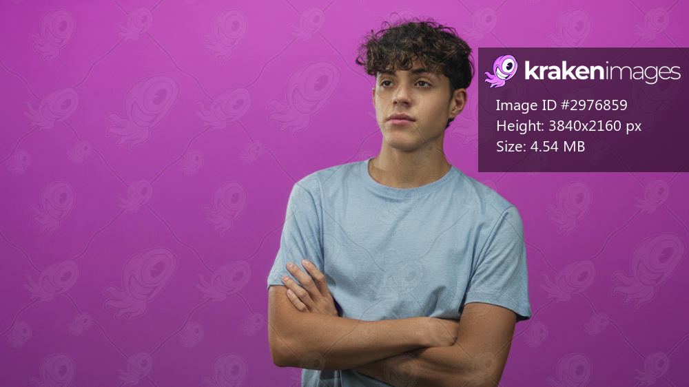 Teenage man stands with arms crossed wearing light blue tshirt against a vibrant purple studio backdrop, neutral expression and folded arms visible; confidence. - Kraken Images