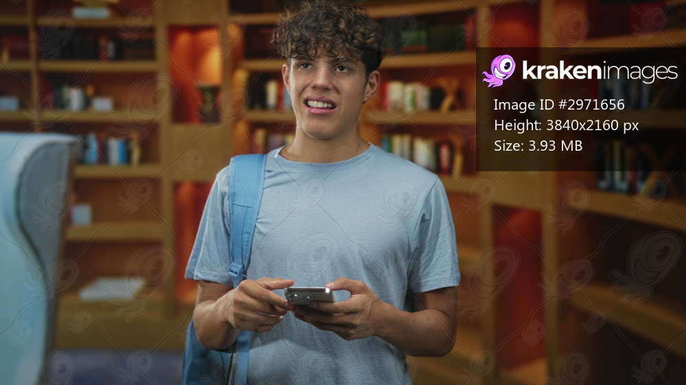 Teenage man wearing blue tshirt and backpack, holding smartphone and grimacing while looking down in library building; frustration focus.