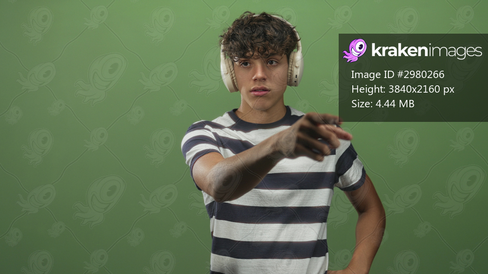 Teenage man wearing headphones points finger toward camera in a green studio; concentration intent focus.
