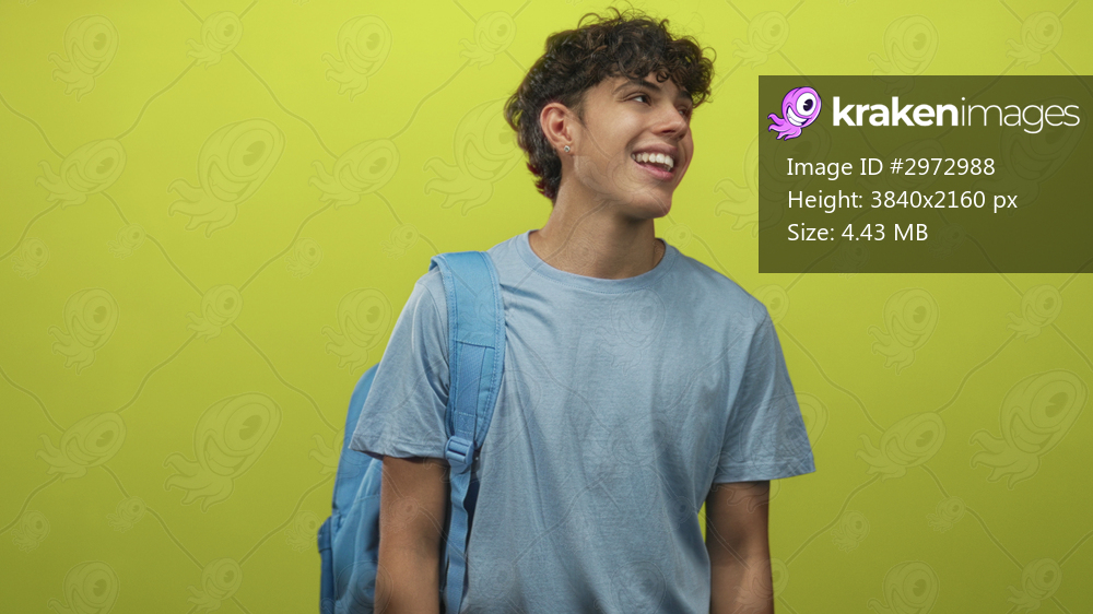 Teenage man wearing light blue tshirt with blue backpack smiling and looking up against lime green studio backdrop; joyful optimism.