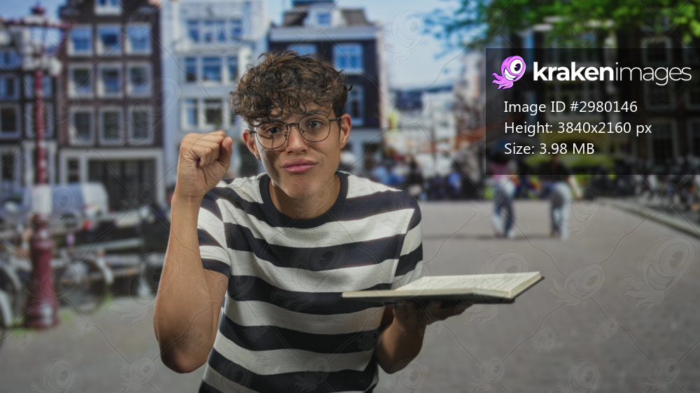 Teenage man wearing striped t shirt and glasses holding open book and shrugging shoulders on cobblestone street; playful curiosity.