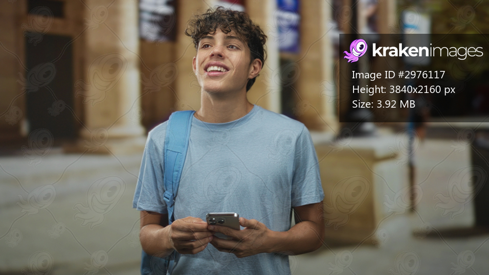 Teenage student boy holding smartphone and backpack, looking up and smiling on a city street in front of stone columns and steps; curiosity discovery.