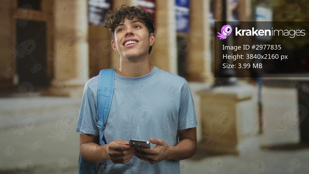 Teenage student boy holding smartphone and backpack, looking up and smiling on a city street in front of stone columns and steps; curiosity discovery.