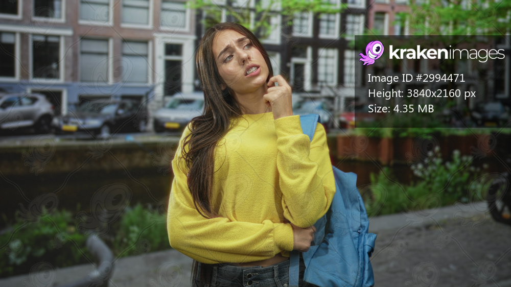 Teenage student girl with braces and yellow sweater carrying a blue backpack touches her chin then clenches a fist on street by canal and parked cars; contemplation confidence. - Kraken Images