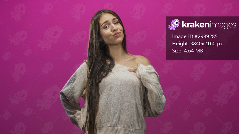 Teenage woman with braces, hand on shoulder and hand on hip, smiling against a magenta studio backdrop; youthful confidence.