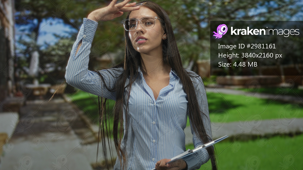 Teenage woman with clipboard and pen smiles then shades her eyes while standing on a garden path near a building; curiosity outdoor study focus.