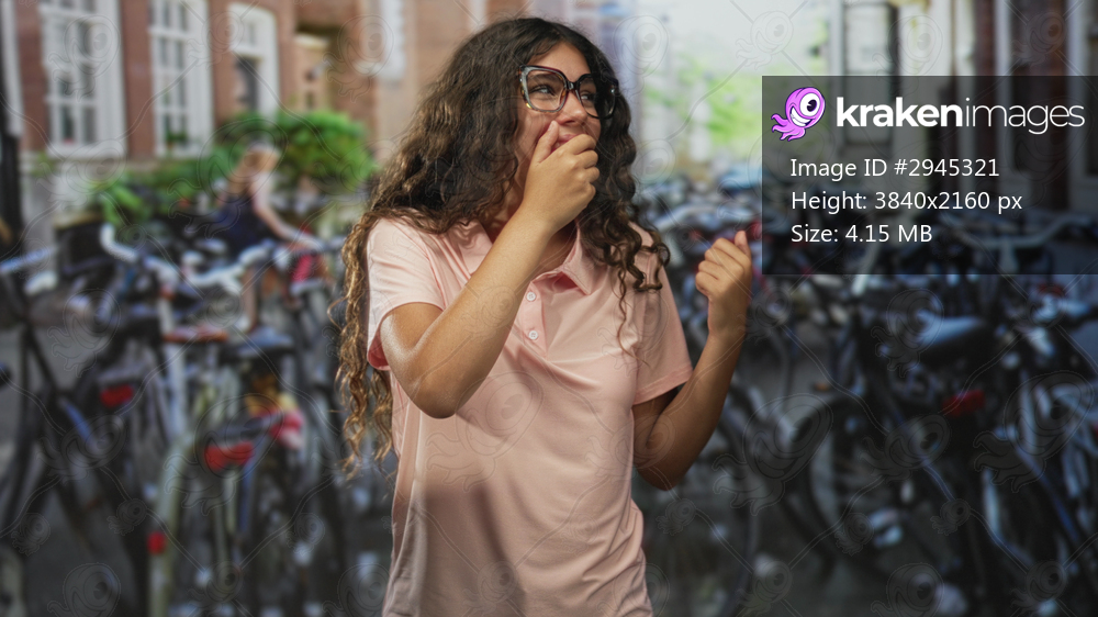 Teenage woman covering mouth with hand beside parked bicycles on a street, wearing glasses and pink polo shirt; amusement.