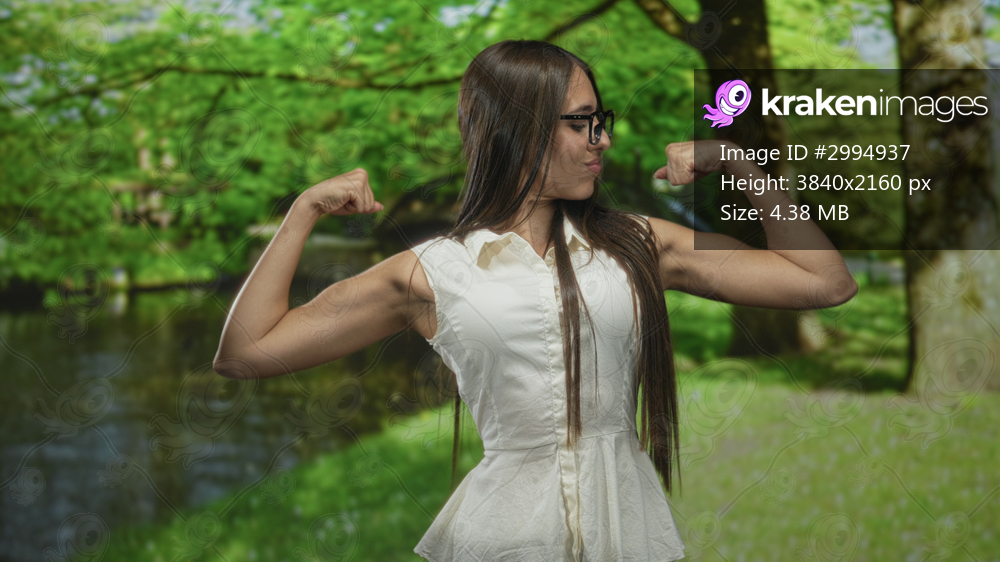 Teenage woman flexes bare biceps and smiles while posing in a forest by a pond, wearing white sleeveless blouse; confidence.