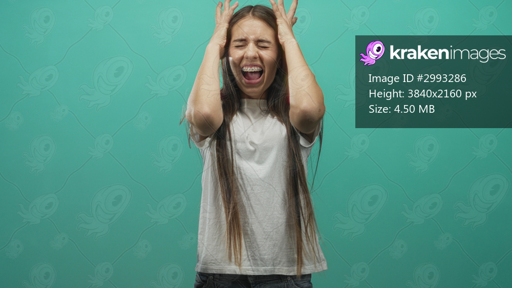 Teenage woman with hands on head screaming, mouth open showing braces, long hair and white t shirt in studio; teen frustration.