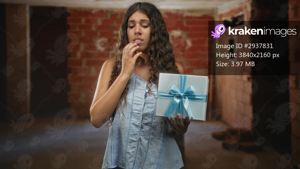 Teenage woman holding a gift box tied with a blue ribbon in an unfinished brick building, hand gripping the box at chest level, visible facial expression; unease. - Kraken Images