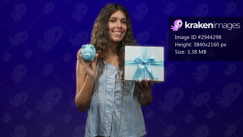 Teenage woman holding blue piggy bank and white gift box tied with blue ribbon in studio, smiling at camera; hopeful savings future.
