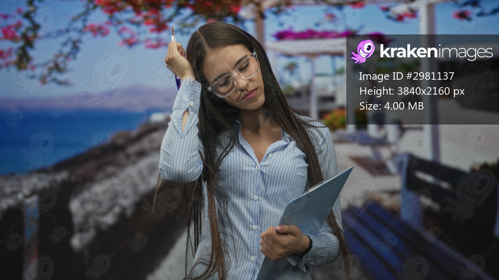 Teenage woman holding clipboard and pen touches hair while wearing clear glasses and striped shirt in studio before a seaside mural; pensive.