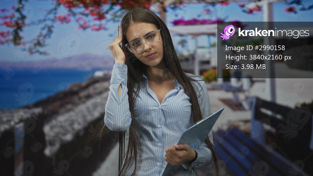 Teenage woman holding clipboard and pen touches hair while wearing clear glasses and striped shirt in studio before a seaside mural; pensive.