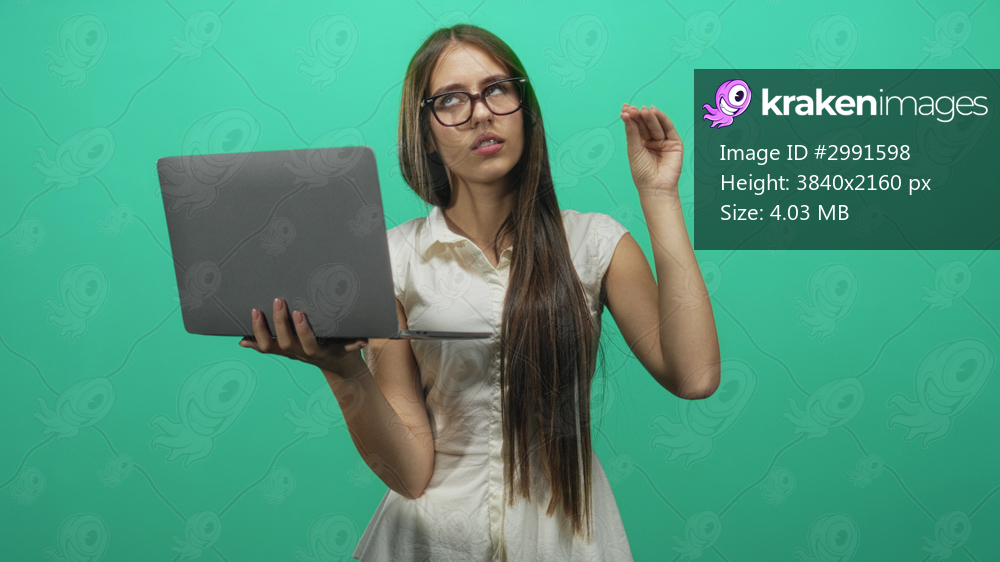 Teenage woman holding laptop with left hand, right hand pinching air, wearing glasses and long hair visible against green studio backdrop; thoughtful focus. - Kraken Images