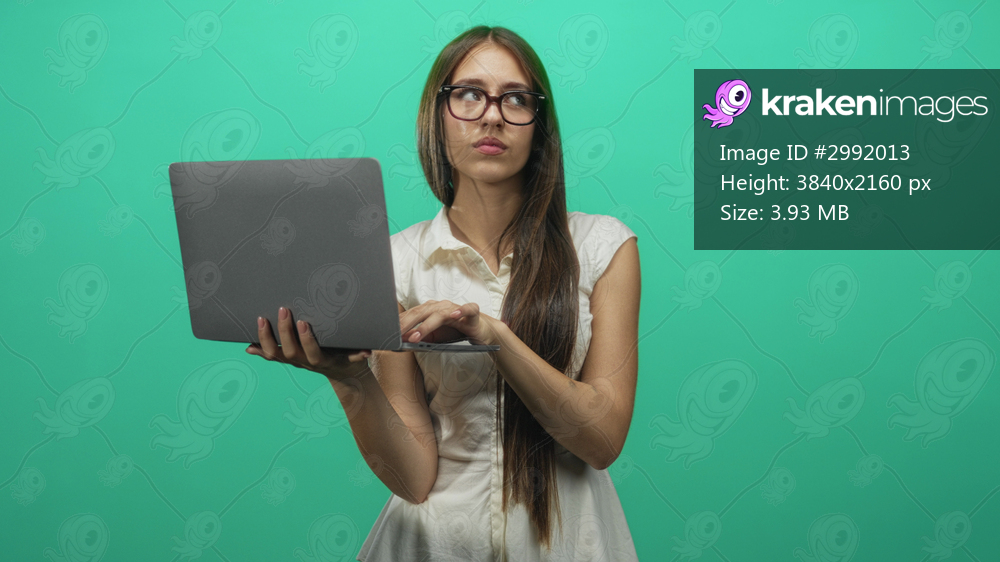 Teenage woman holding laptop with left hand, right hand pinching air, wearing glasses and long hair visible against green studio backdrop; thoughtful focus. - Kraken Images