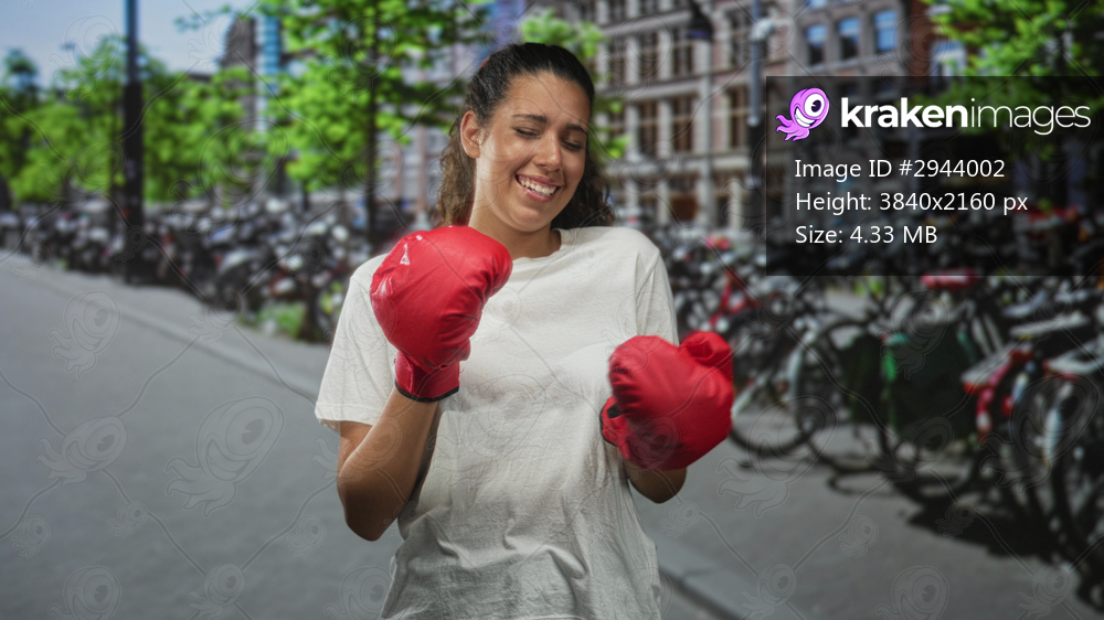 Teenage woman holding red boxing gloves and smiling on a city street with rows of parked bicycles and brick buildings behind her; joyful confidence.