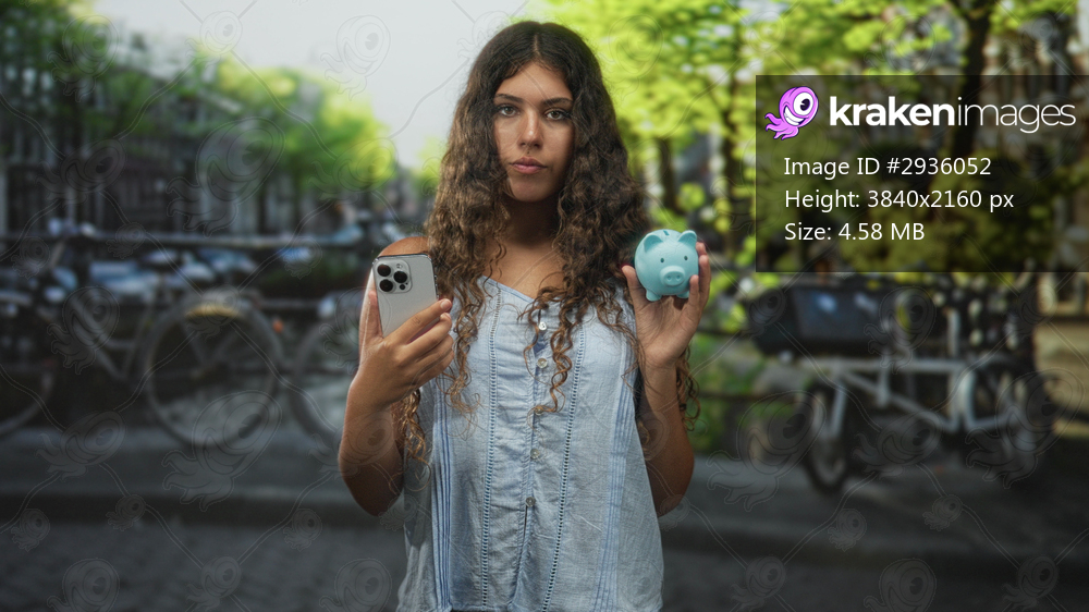 Teenage woman holding smartphone and blue piggybank, eyes closed and thoughtful pose on street; worry saving budgeting.