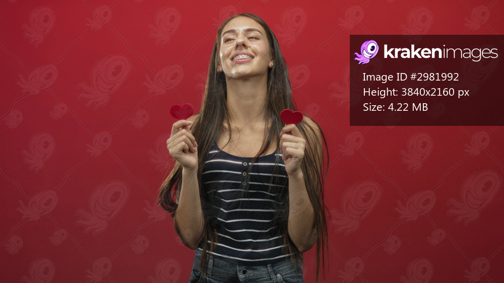 Teenage woman holding two small red felt hearts with both hands in studio smiling with braces; love joy affection.