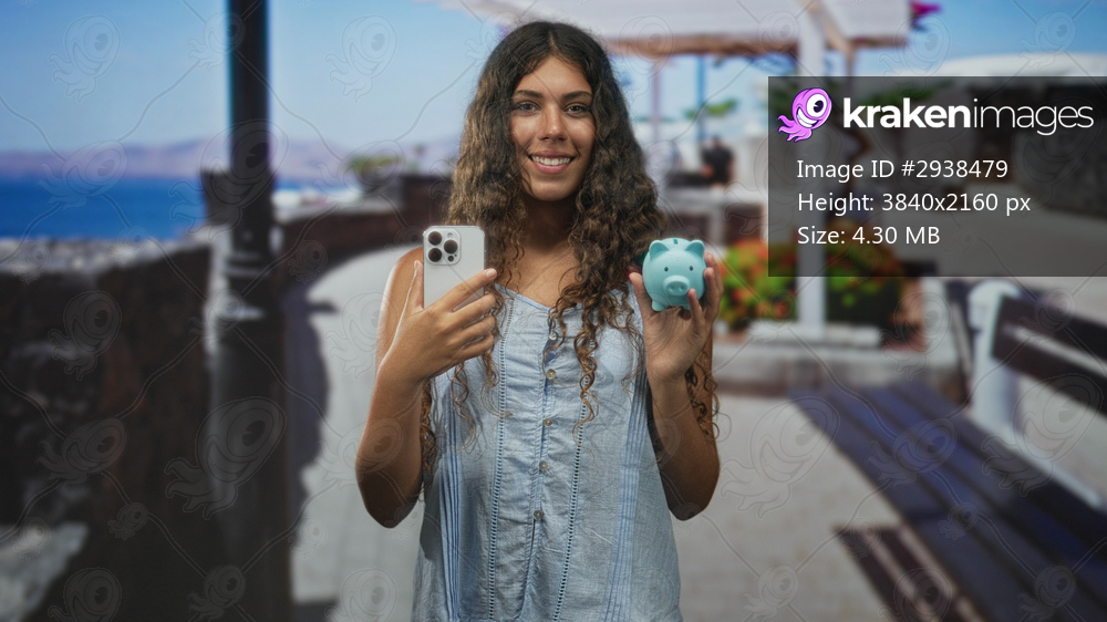 Teenage woman holds piggy bank and smartphone, smiles while facing camera on a street; financial optimism.