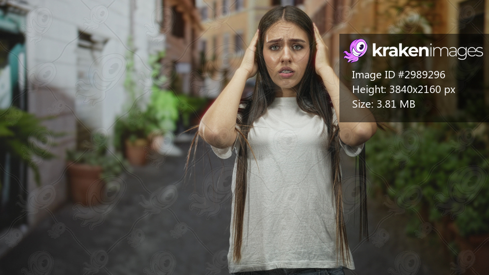 Teenage woman in white t shirt with long hair holding hands to ears while standing in a narrow street lined with potted plants; anxiety isolation.