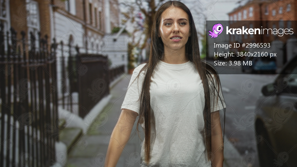 Teenage woman in white tshirt with braces touches forehead and adjusts long hair while standing on a residential street by iron fence; uncertain.