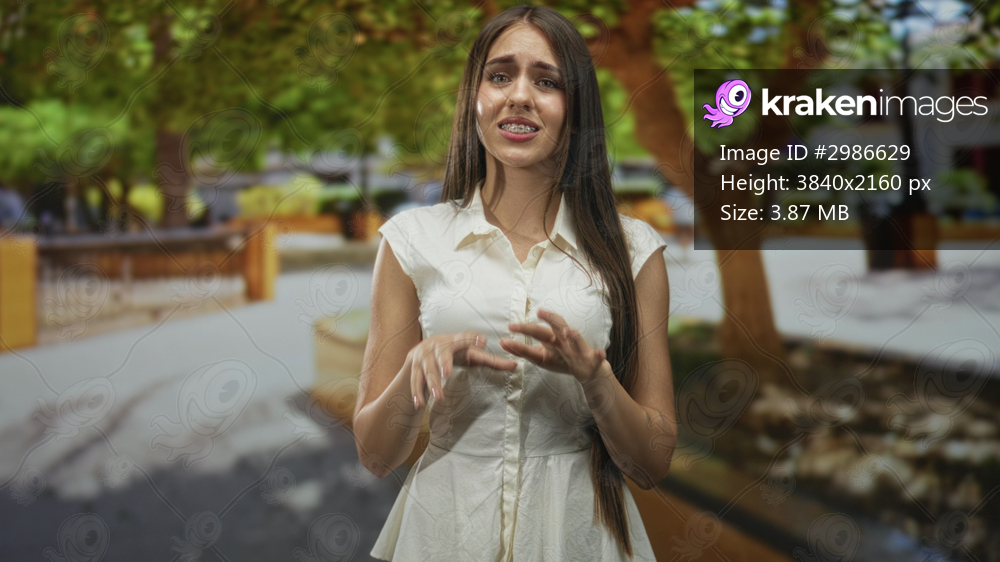 Teenage woman with long hair gesturing with hands and visible braces while speaking on a sunlit street scene; explanation uncertainty.