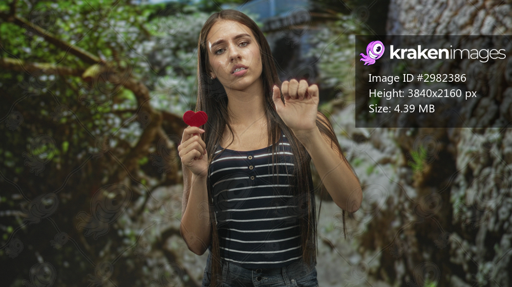 Teenage woman with long hair wearing striped tank top holding a small red heart while raising her right fist in forest; longing resilience.