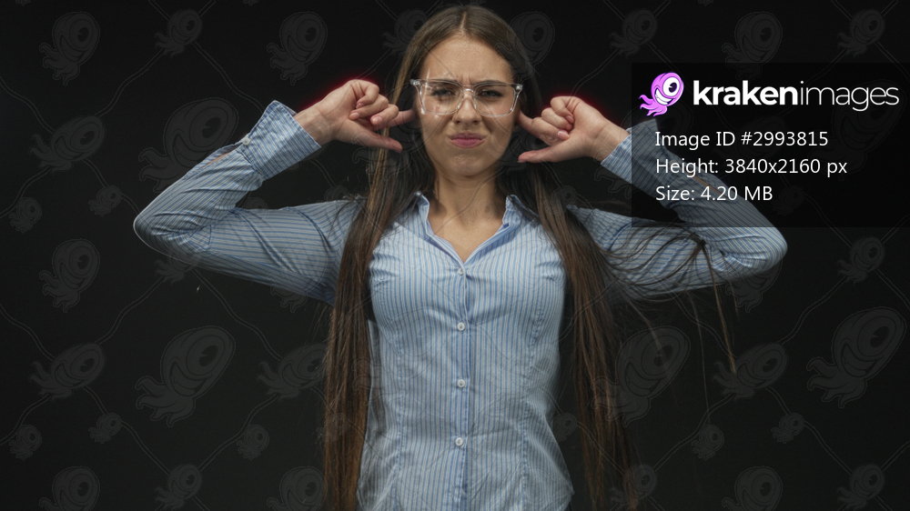 Teenage woman plugs ears with fingers in a studio with black backdrop and long hair visible; sensory overload frustration.