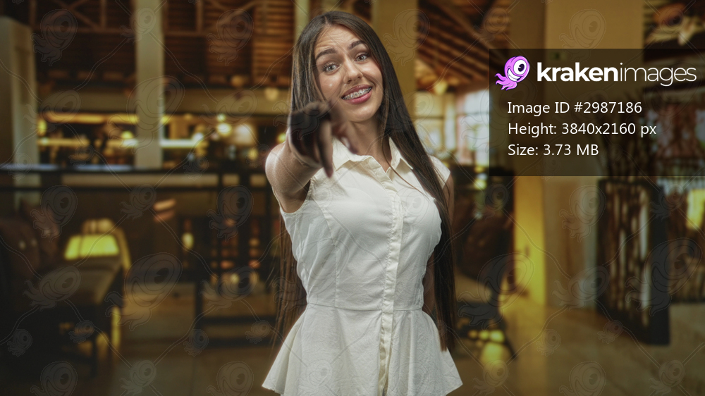 Teenage woman points finger at camera in hotel building lobby smiling with braces; joyful playful confidence.