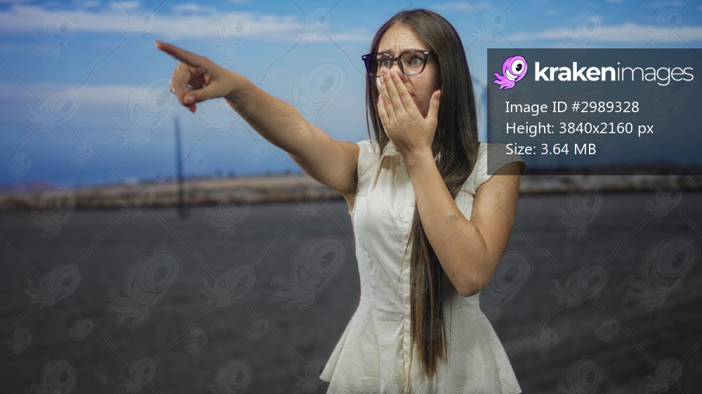 Teenage woman points finger outward and covers mouth with hand on a shore, glasses and white dress visible; surprise curiosity discovery.