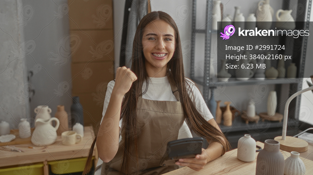 Teenage woman potter smiling with braces taps card reader then raises fist in a celebratory pump in a pottery studio surrounded by handmade vases and pitchers; satisfaction. - Kraken Images