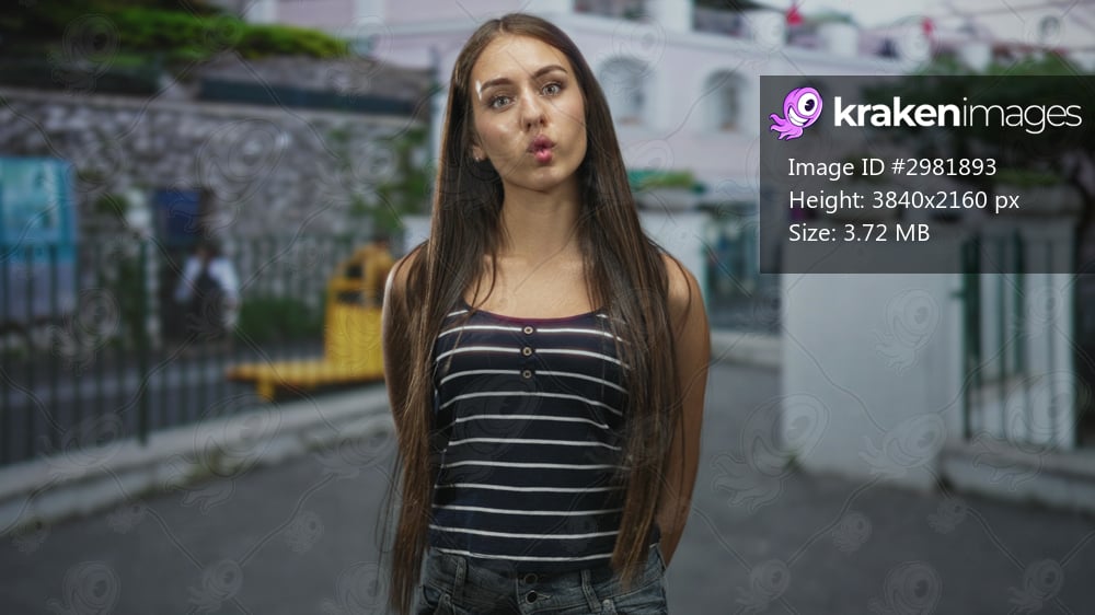 Teenage woman pouts lips, shoulders bare in striped tanktop, standing with arms behind back on a street by a building; playful confidence.