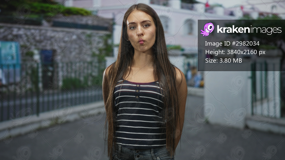 Teenage woman pouts lips, shoulders bare in striped tanktop, standing with arms behind back on a street by a building; playful confidence.