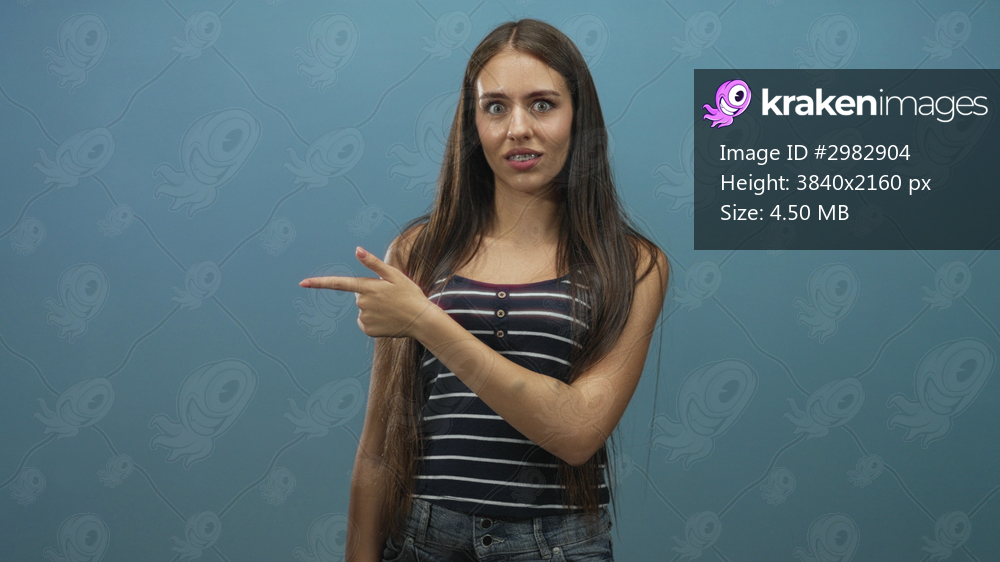 Teenage woman pressing finger to lips for silence in studio with blue wall, striped tank top, long hair and pointing gestures across frames; secrecy.