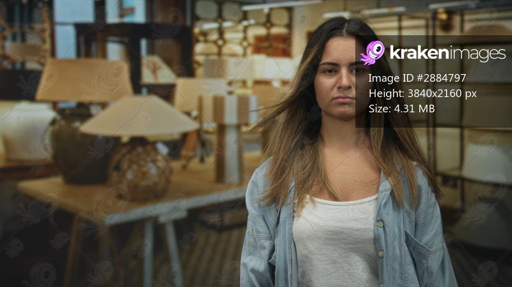 Teenage woman rolling eyes and pouting beside lamp displays in a store building aisle; boredom shopping.