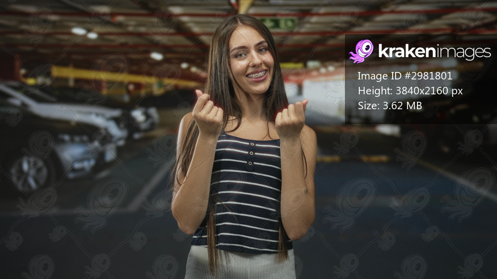 Teenage woman smiling with braces makes finger heart gesture with hands in parking building among cars and lights; playful affection.