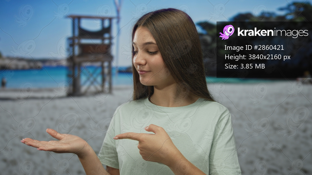 Teenage woman smiling and showing thumbs up at sunny beach lifeguard tower with sand and turquoise sea; confidence approval.