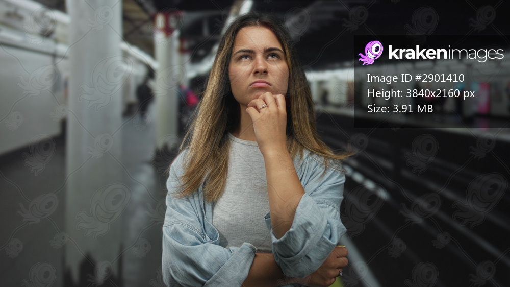 Teenage woman touching cheek and showing middle finger on a subway train platform inside a station building; urban defiance.
