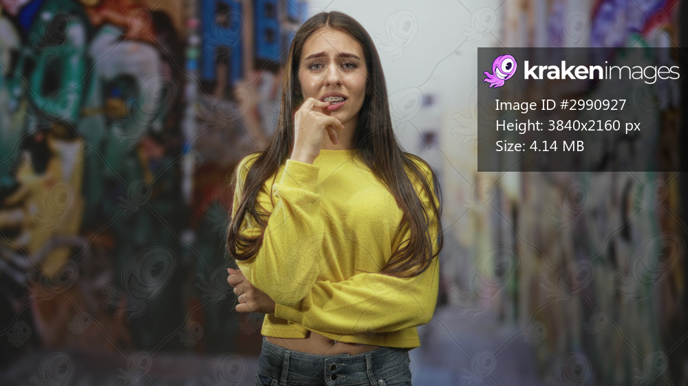 Teenage woman touching temple with two fingers and arms crossed, slight frown, wearing yellow sweater in a graffiti street; pensive uncertainty.