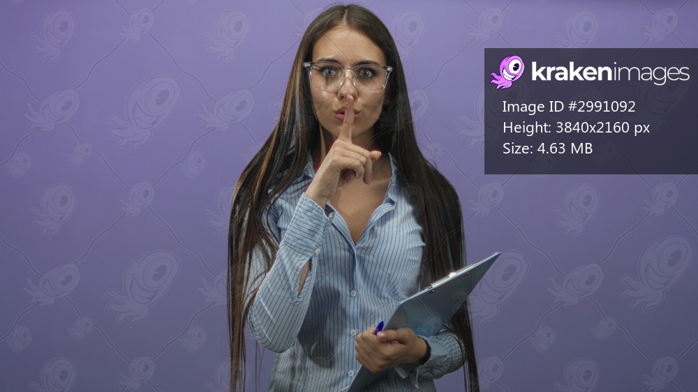 Teenage woman wearing glasses holding clipboard presses finger to lips for silence in studio; silence serious.