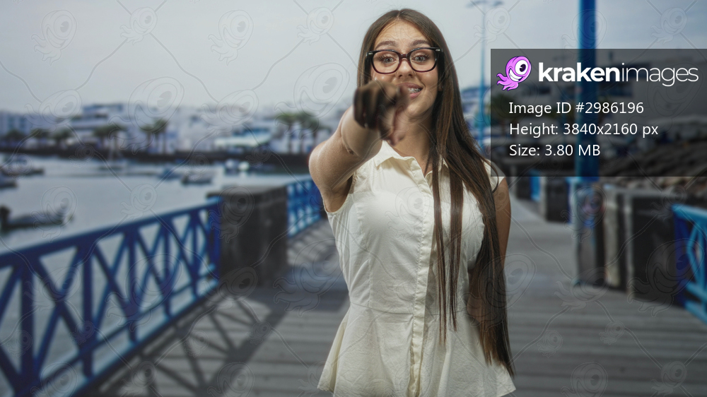Teenage woman wearing glasses points finger at camera on a marina street, long hair and sleeveless dress visible; confident invitation.