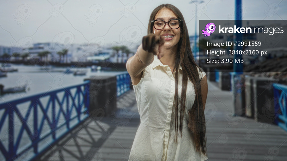 Teenage woman wearing glasses points finger at camera on a marina street, long hair and sleeveless dress visible; confident invitation.