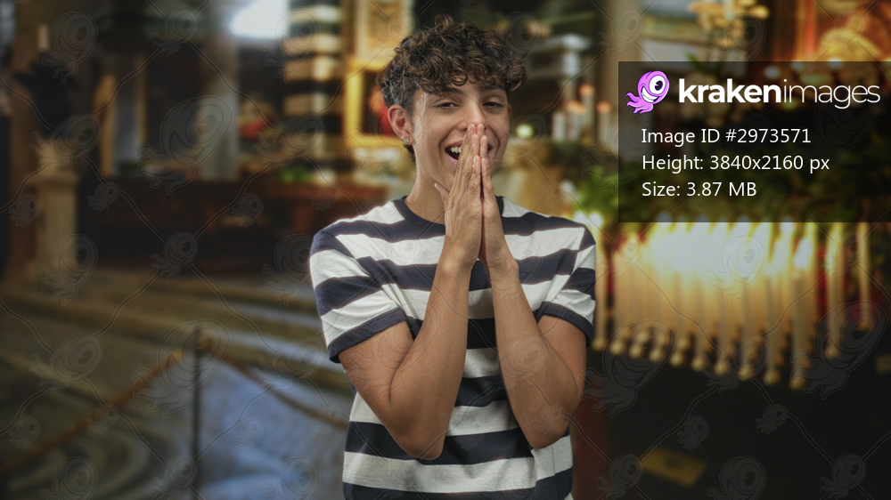 Teenager covers face with hands beside lit votive candles in a historic church building wearing striped shirt and curly hair showing nervous smile; surprise. - Kraken Images