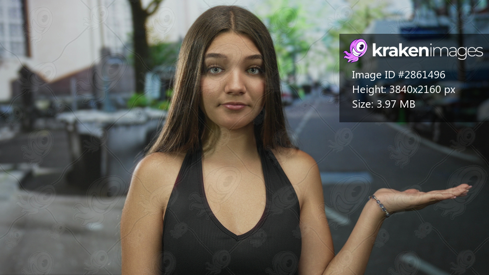 Teenager girl displays a right hand palm gesture with exposed shoulder in a city street scene; uncertainty.