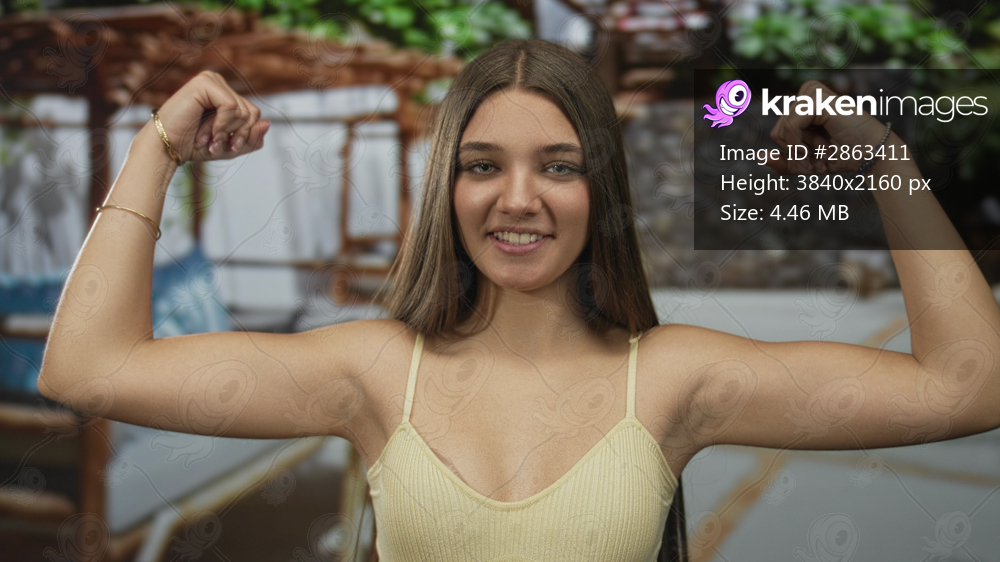 Teenager girl flexes bare arms at building in daylight sunlight; confidence empowerment strength pride.