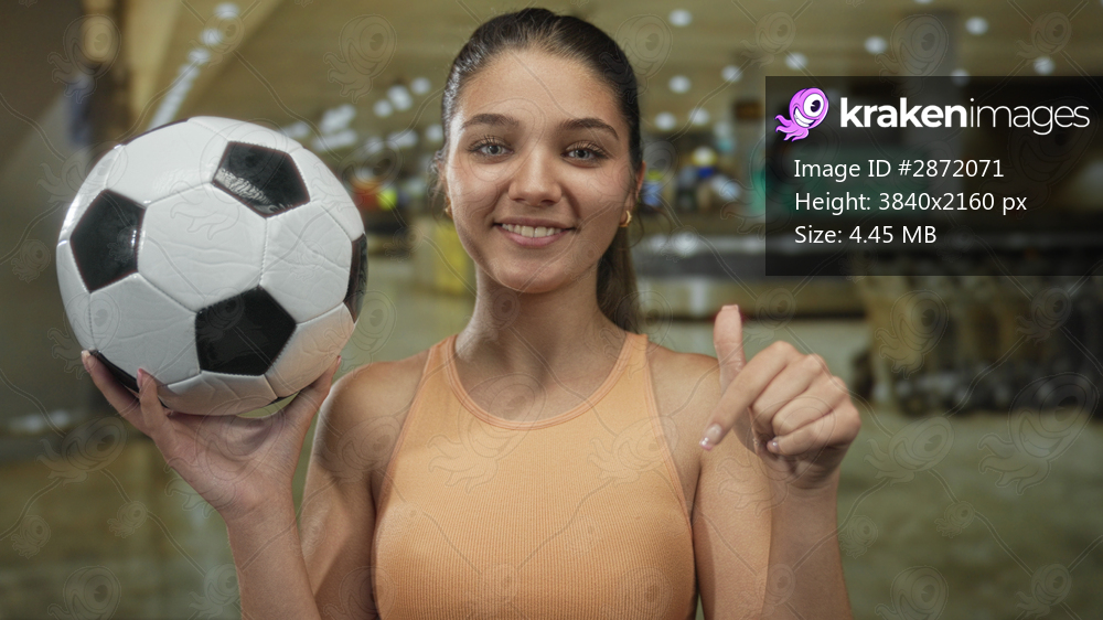 Teenager girl holds a black and white soccer ball and points her thumb down beside baggage trolleys in an airport terminal; disapproval.