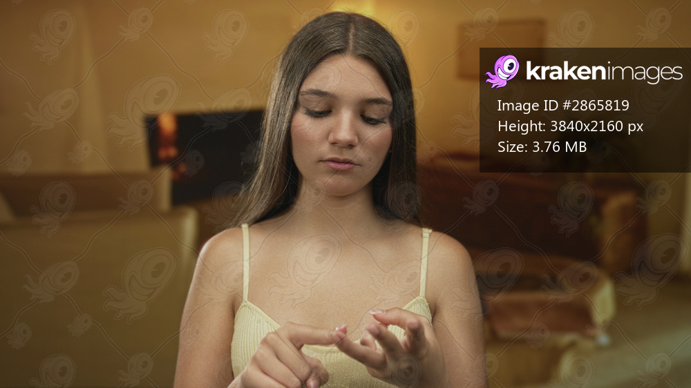 Teenager girl touching her fingernail and examining hand gesture in a living room setting; quiet contemplation.