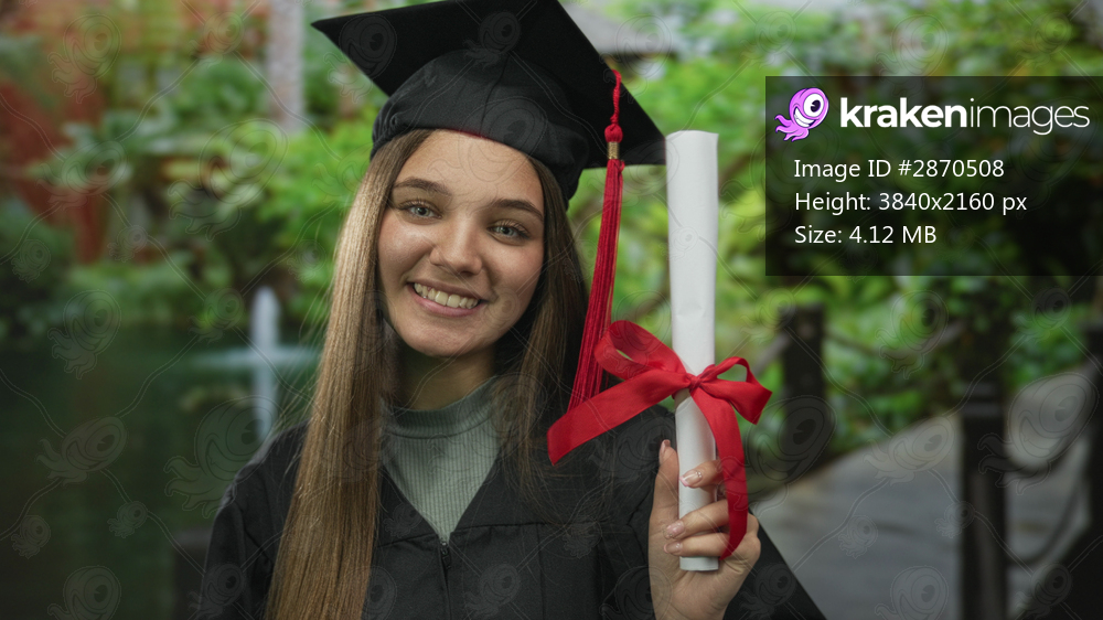 Teenager girl wearing graduation cap and gown holds diploma scroll with hand in green forest; achievement pride.