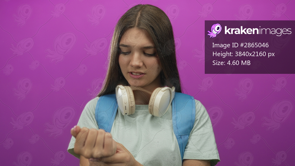 Teenager girl wearing headphones and backpack frowning as she holds wrist in purple studio; discomfort.